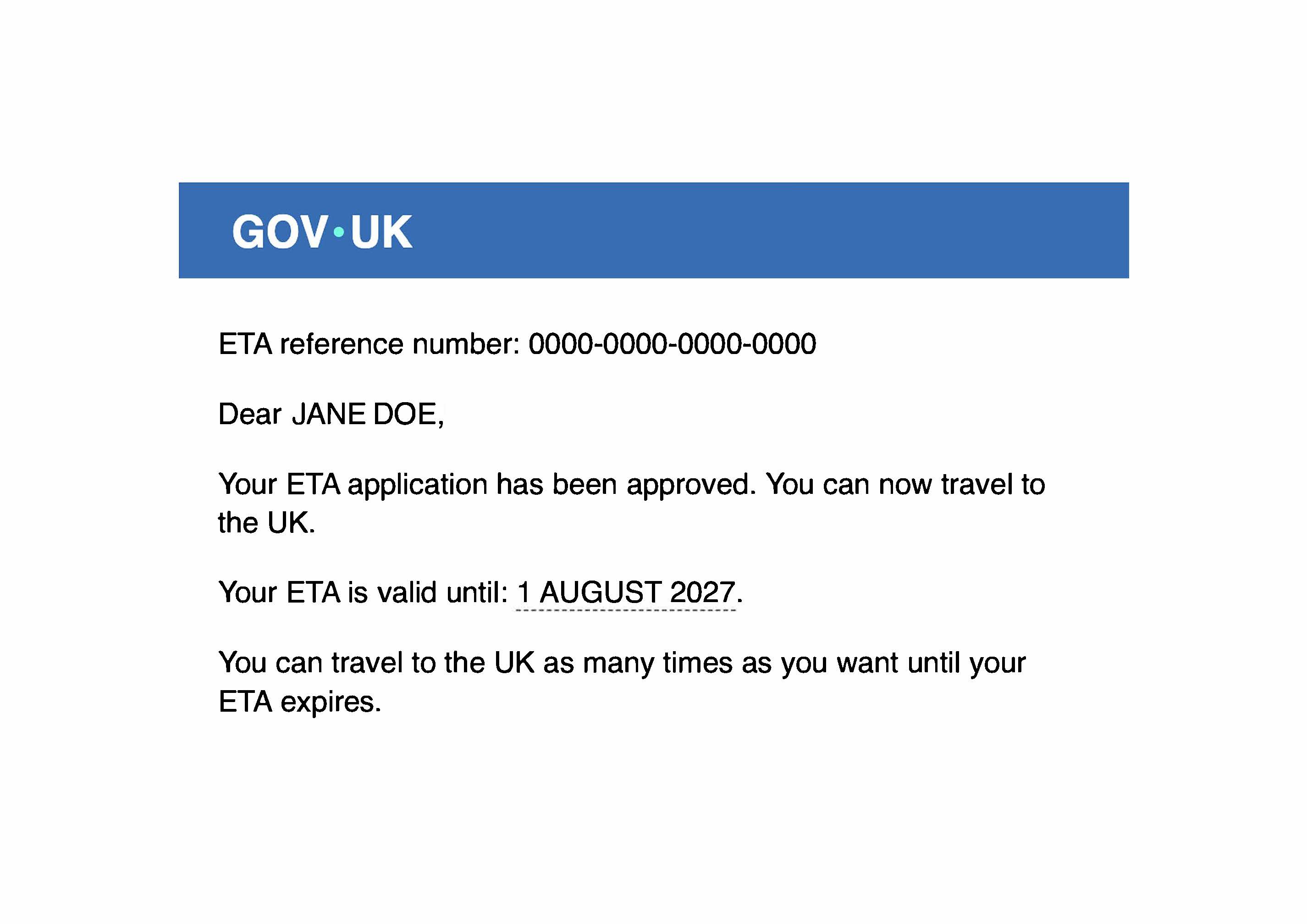 Example of a UK eTA Confirmation Email (For Reference Only)